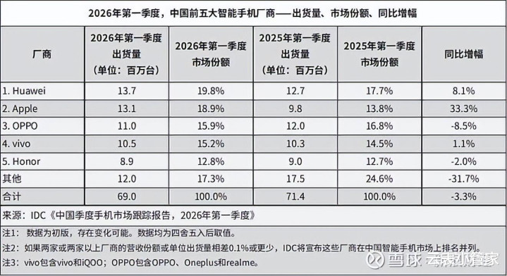华为悄无声息地拿下了第一,份额快摸到20%了。1370万台,19.8%的市场份额。苹果跟在后面,差距不大,但OPPO、vivo、荣耀都在往下掉。最惨的是小米,直接跌出了前五。